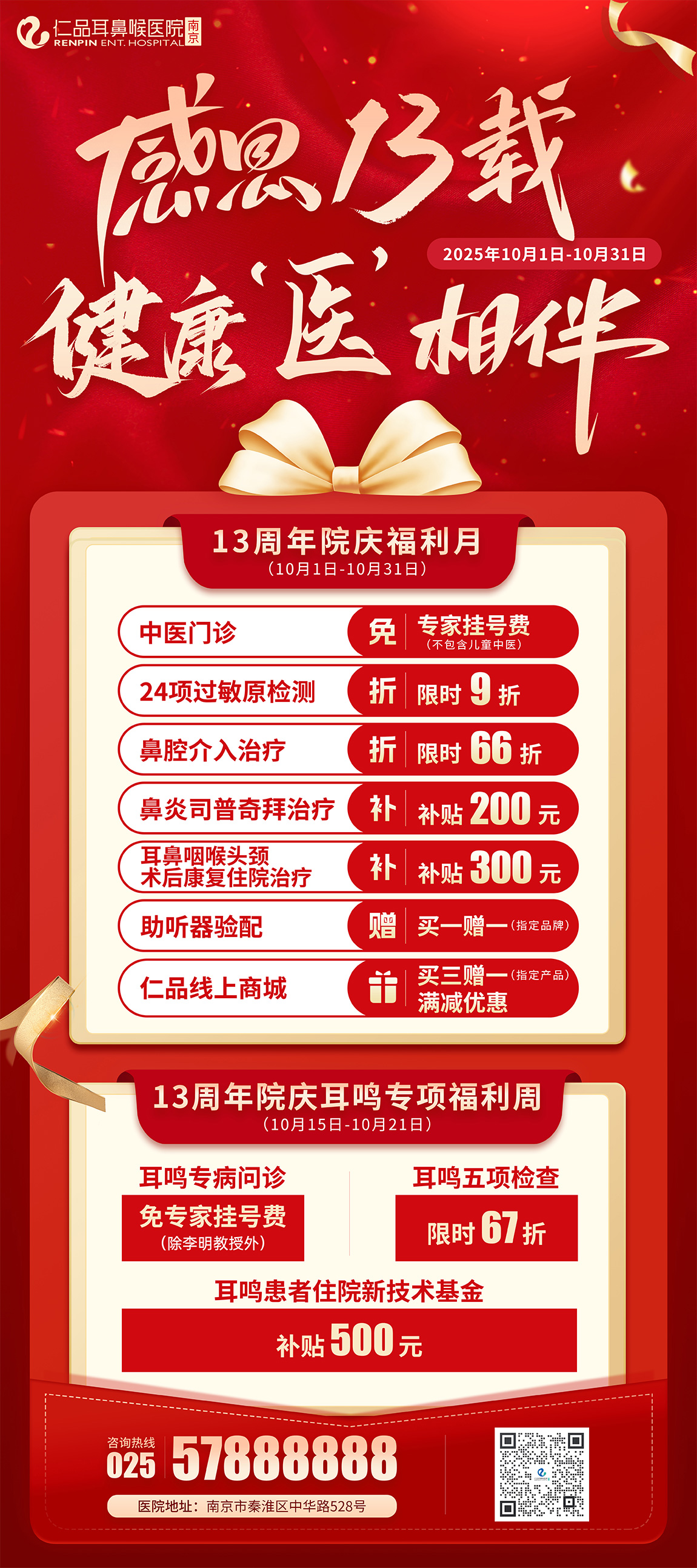 目前,南京仁品13周年院庆系列活动已正式启动预约,患者可通过“南京仁品耳鼻喉专科医院”微信公众号或拨打025—5788888咨询电话了解活动详情并预约参与,切勿错过这份健康福利!